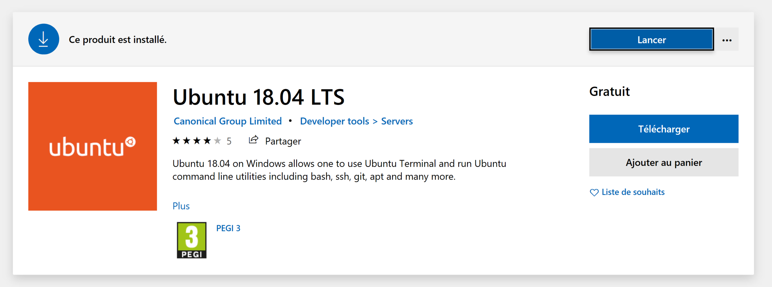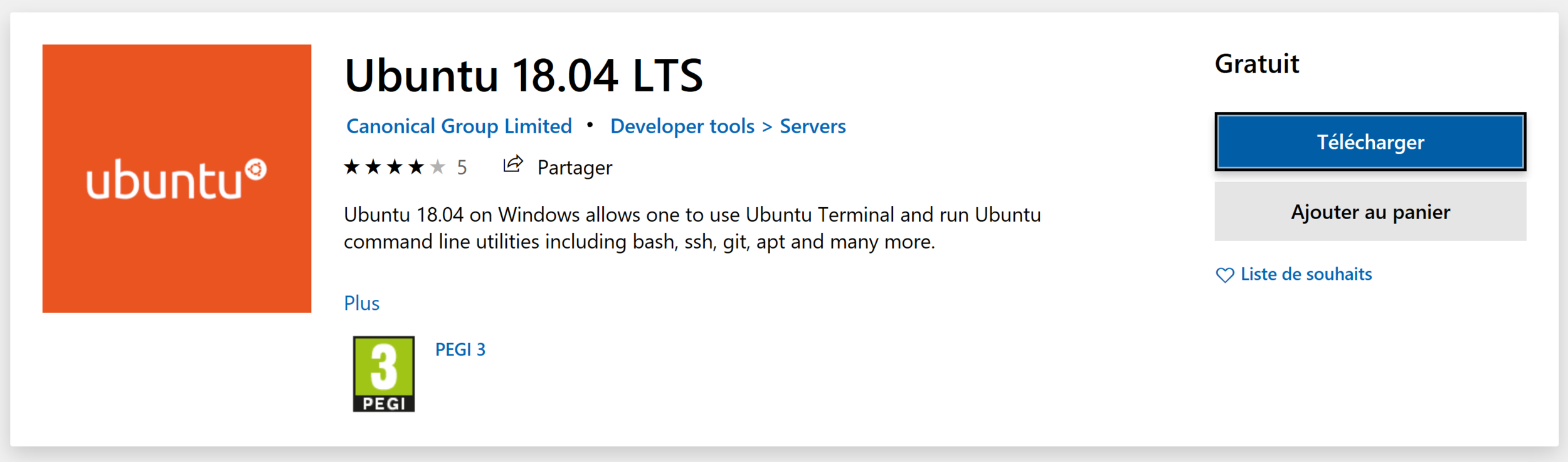 Sur windows store, rechercher et télécharger ubuntu 18.04 LTS