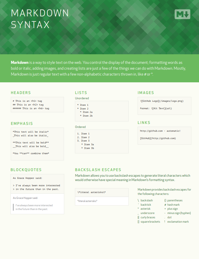 Github guides : ​https://guides.github.com/features/mastering-markdown/
