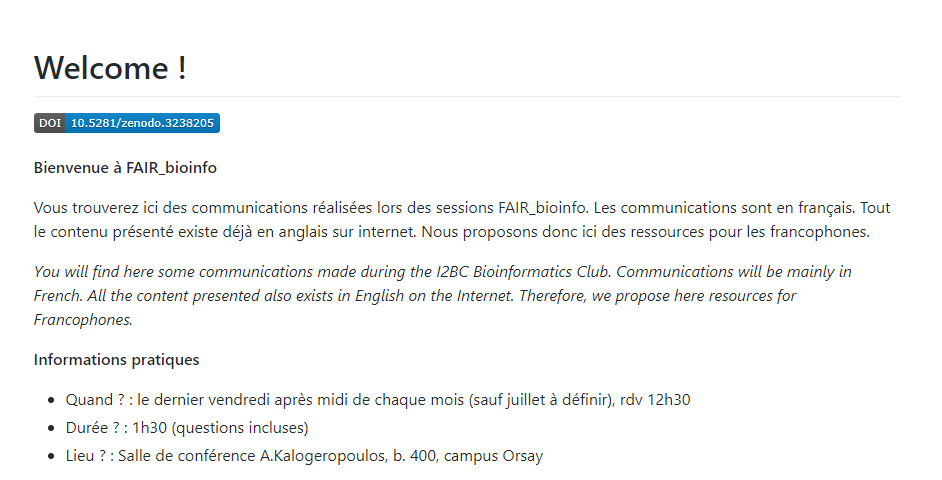 Vous trouverez ici des communications réalisées lors des sessions FAIR_bioinfo. Les communications sont en français. Tout le contenu présenté existe déjà en anglais sur internet. Nous proposons donc ici des ressources pour les francophones.